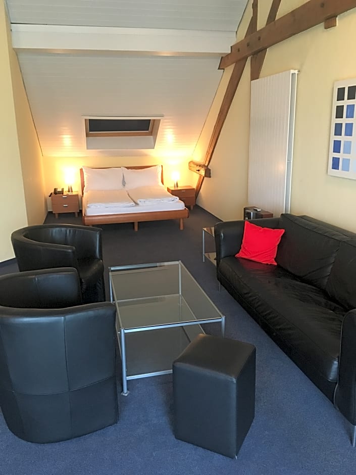 Junior suite in the attic with a seating area with sofa and armchairs, a large flat-screen TV and a DVD player. The bathroom has a big spa bath.